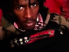 Cocksucked black twink cums after riding unsaddled bf