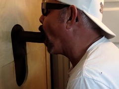 Gloryhole mature DILF teasing balls and blowing black cocks